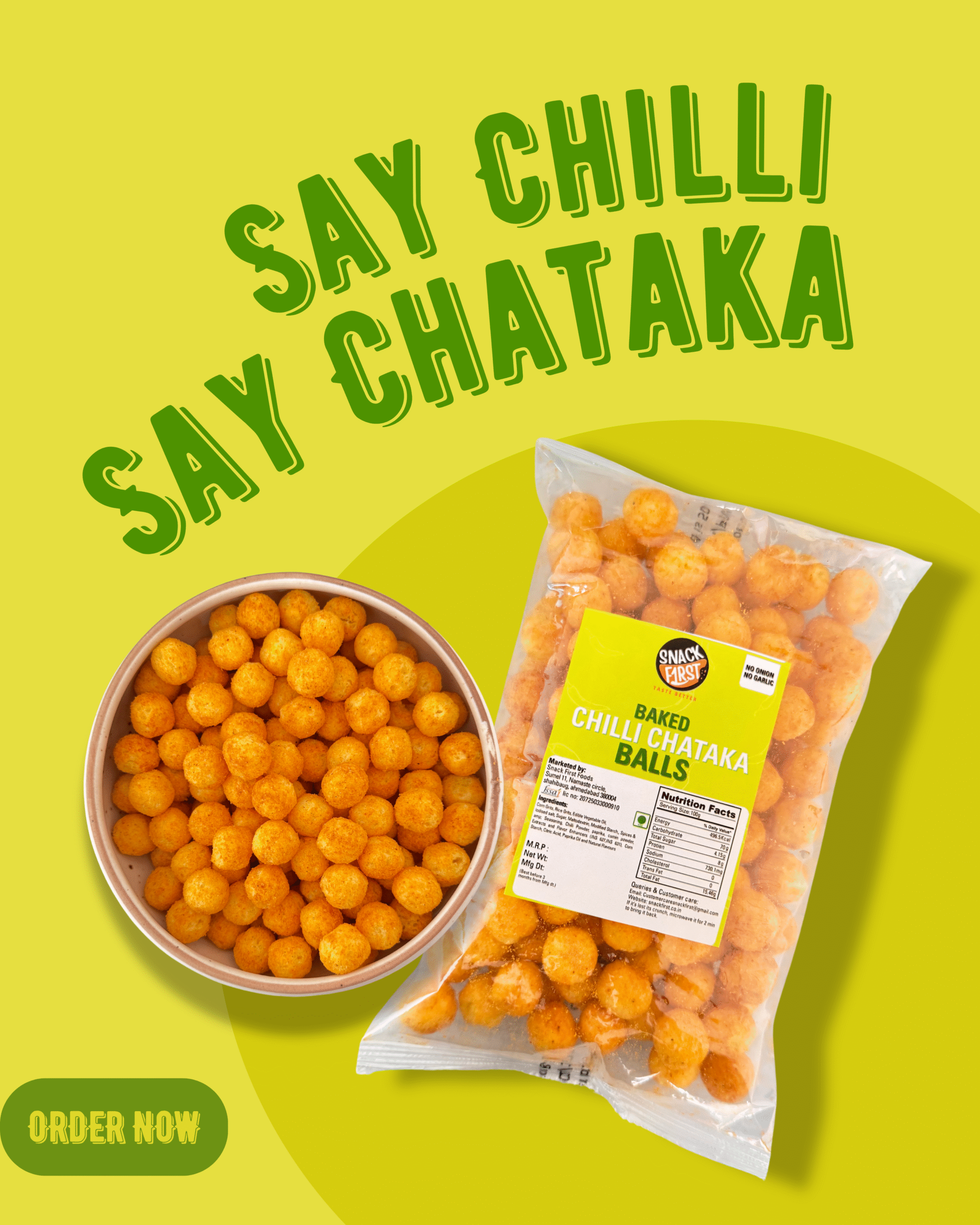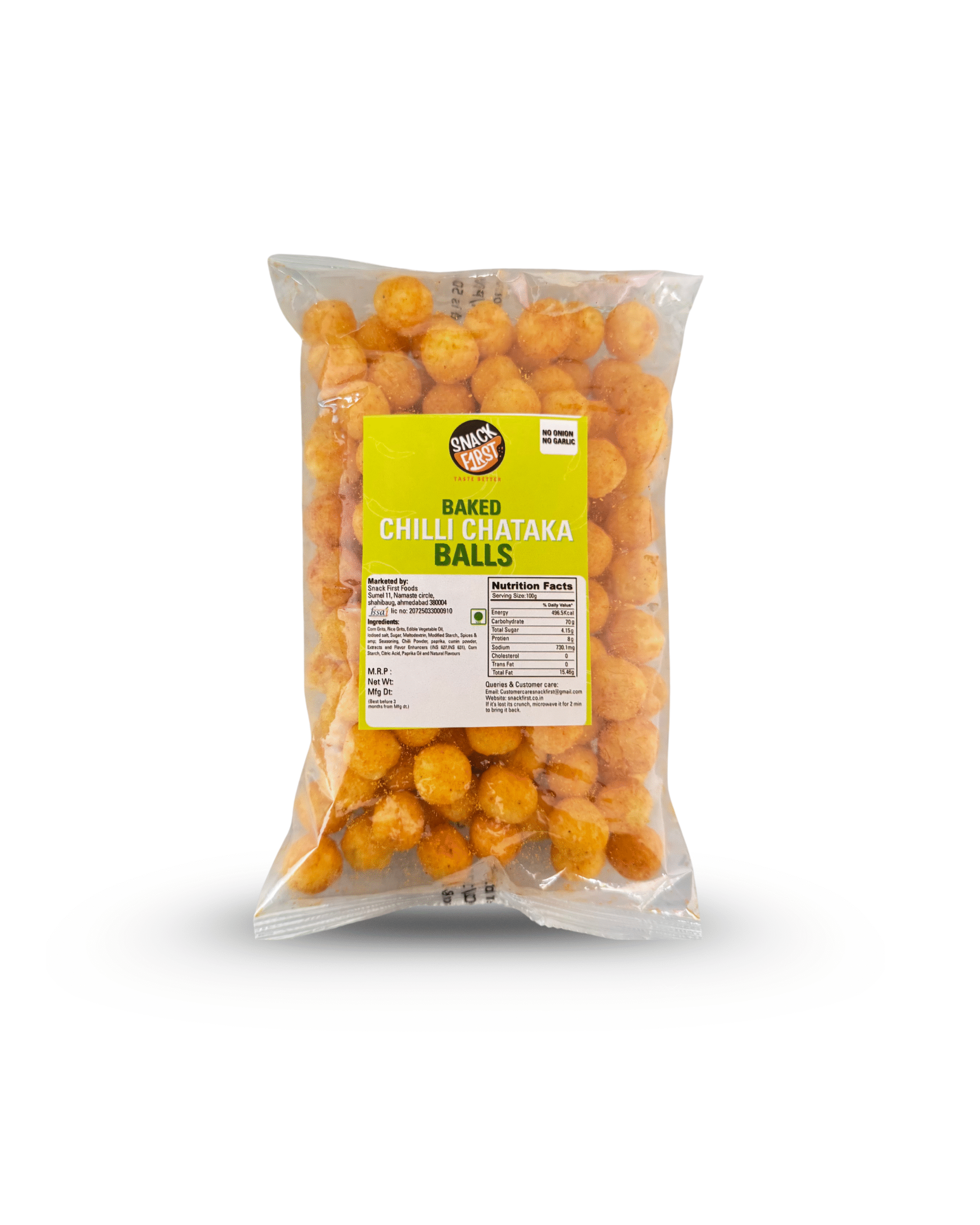 Snack First Baked CHILLI CHATAKA BALLS are a healthy, guilt-free snack made from corn and baked instead of fried, making them light and crunchy. Rich in fiber, cholesterol-free, zero trans fat, and vegetarian, it offers a low-calorie, crunchy treat for all age groups.