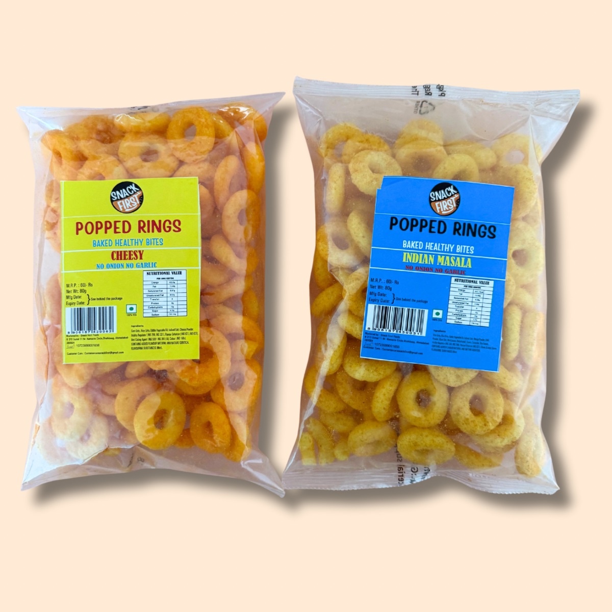 Snack First Baked Cheese & Masala Popped Rings has sweet- spice tangy flavor and they are a healthy, guilt-free snack made from corn and
