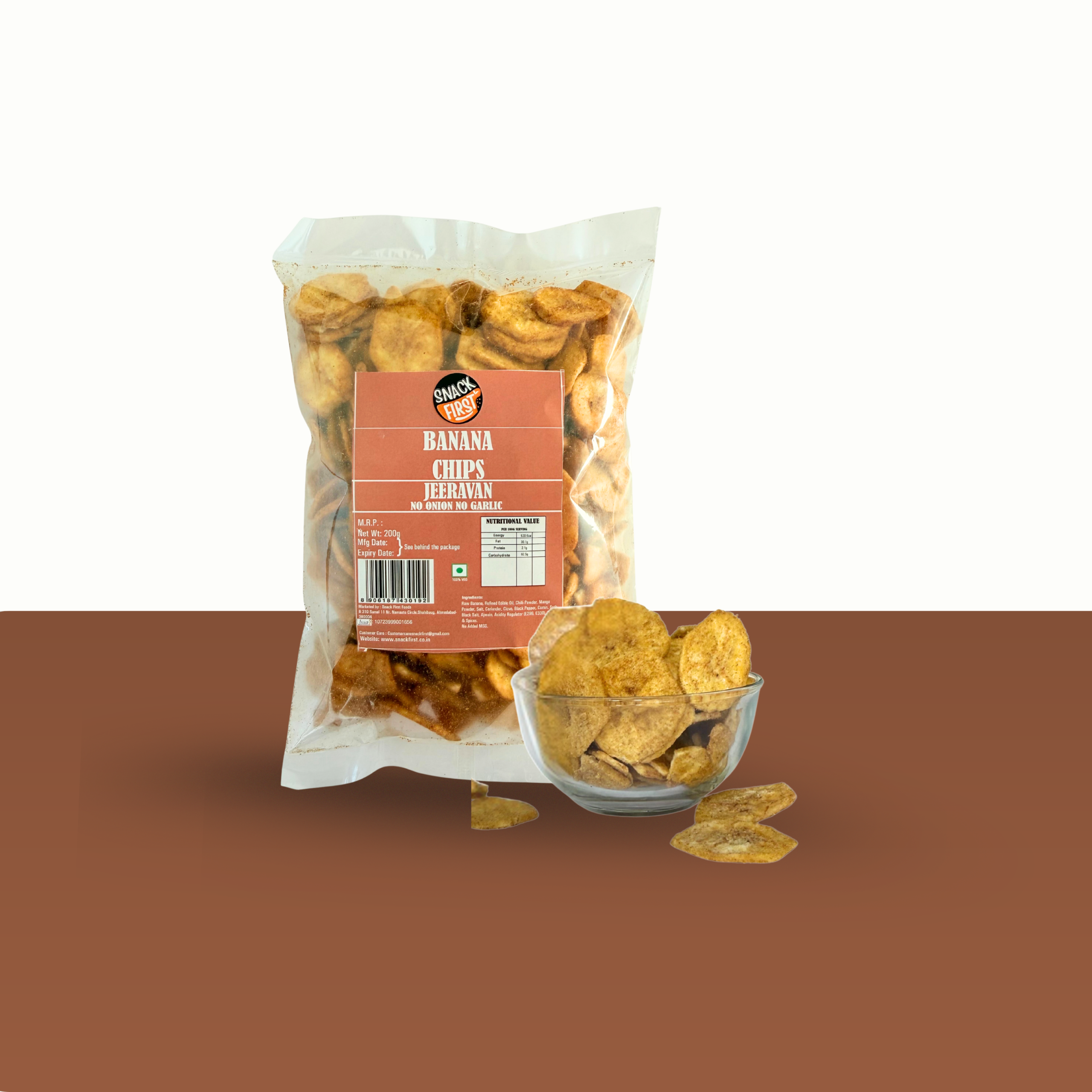SThinly sliced raw bananas, gently fried to crisp perfection and tossed in a Jeeravan spice blend. These chips pack a punch of heat and flavor without the guilt –no preservatives, just pure crunch! Perfect for your spicy cravings, whether you’re fasting, snacking, or just need a fiery pick-me-up.